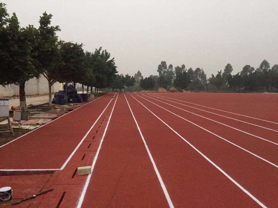 鋪裝并硬底化農村基層后,將水放干以尋找積水點,塑膠跑道施工并依照所述全過程整平積水地區,直到面漆中沒有積水已經。面漆徹底硬底化后,用沙輪片打磨拋光表面以做到罩光漆的規定,隨后表面開展地面防滑噴漆。
